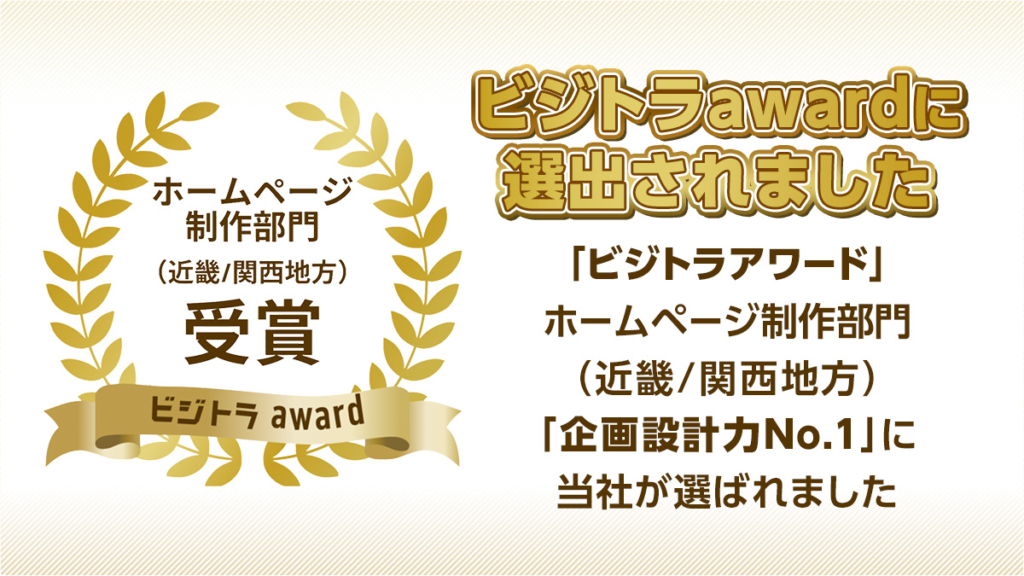 このたび弊社が株式会社ふるさと本舗様が運営するBtoB企業の比較・発注プラットフォーム「ビジトラ」の『ビジトラアワード』のホームページ制作部門(近畿/関西地方)において「企画・設計力No.1」をいただきました。